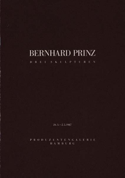 Prinz, Bernhard: Drei Skulpturen. Auflage 800 Exemplare. Hamburg. Produzentengalerie. 1987. 29,5 x 21 cm. 12 unpaginierte s. OBroschur. Sehr gutes Exemplar. Katalog zur Ausstellung Hamburg 26. 3. bis 2. 5. 1987 durchgehend mit ganzseitigen Abbildungen sowie einem Text von Veit Loers versehen.