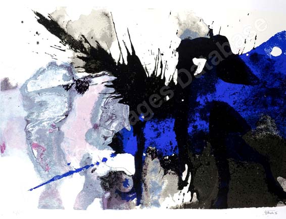 Thieler, Fred: Ohne Titel. Farbige Komposition. Sehr gutes Exemplar. Farblithographie auf Museumskarton, 1996. (Bildinhalt) 71 x 101 cm, Blatt 86 x 112 cm. Gerahmt in silbern mattiertem Holzrahmen unter Glas, 93,5 x 120 cm. Links unten nummeriert 26 / 30, rechts signiert und datiert 1996. (Transportkosten auf Anfrage!).