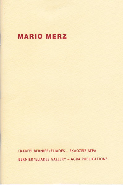 Merz, Mario: Mario Merz. Erste Auflage. Athen. Bernier/ Eliades. 2015. 20,5 x 14 cm. 32 unpaginierte S. OBroschur. Einbandkanten etwas nachgedunkelt und stellenweise mit kleinen Fleckchen. Sonst sehr gutes Exemplar. Katalog zur Ausstellung Athen 26. November 2015 bis 28. Januar 2016 mit ganzseitigen Abbildungen, Ausstellungsverzeichnis sowie Bio-/ Bibliographie in griechischer und englischer Sprache versehen.