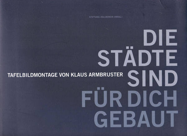 Armbruster, Klaus: Die Städte sind für Dich gebaut. Tafelbildmontage von Klaus Armbruster. Erste Auflage. Essen. Stiftung Zollverein. 2011. 24 x 30 cm. 95 S. OKarton. Einbandkanten mit kleinen Bereibungen, kleine beschabte Stelle auf dem Rückendeckel. Sonst gutes bis sehr gutes Exemplar. Katalog zur Ausstellung Essen 15. April bis 27. Mai 2001 durchgehend mit ganzseitigen Abildungen sowie einem Text von Gerhard Finckh versehen. Mit eigenhändiger Widmung des Künstlers auf dem Vortitel.