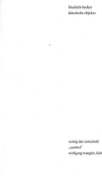 Becker, Friedrich: Kinetische Objekte. 29. März bis 30. Juni 1985 in den Räumen der Zeitschrift „symbol“, Köln. Auflage 1000 Exemplare. Köln. Verlag der Zeitschrift „Symbol“. 1985. 29,5 x 21 cm. 39 S. 3 Bl. OKarton. Einbandkanten etwas nachgedunkelt und mit kleinen Bereibungen. Sonst gutes Exemplar. Durchgehend mit ganzseitigen s/w-Abbildungen versehen