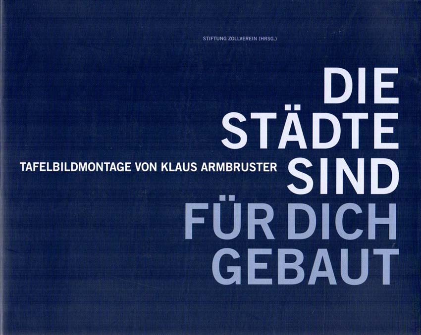 Armbruster, Klaus: DIE STÄDTE SIND FÜR DICH GEBAUT. TAFELBILDMONTAGE VON KLAUS ARMBRUSTER. [Welterbe Zollverein, 15. April bis 27. Mai 2011]. 1. Auflage. Essen. Stiftung Zollverein. 2011. 24 x 30 cm. 95 S. OKarton. Sehr gutes Exemplar. Mit Texten von Gerhard Finckh, Bertolt Brecht und Otto Jägersberg, Vorwort von Jolanta Nölle. Durchgehend mit farbigen Abbildungen versehen.