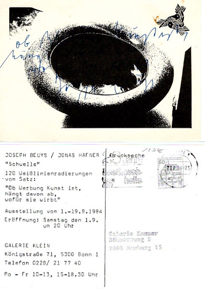 Beuys, Joseph – Jonas Hafner: ″ Schwelle „. [Einladung] Galerie Klein, 1.-19.9.1984. Bonn. Galerie Klein. 1984. 10,5 x 15 cm. 1 Blatt. Illustrierter OKarton. Papier etwas nachgedunkelt und fleckig, sonst gutes Exemplar. Einladungs- und Werbekarte – 120 Weißlinienradierungen vom Satz: ″ Ob Werbung Kunst ist, hängt davon ab, wofür sie wirbt „. Adressiert an die Galerie Kammer, Hamburg.