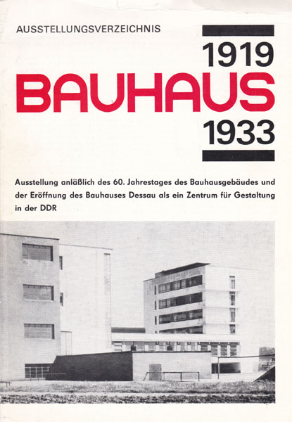 Siebenbrodt, Michael: Ausstellungsverzeichnis Bauhaus 1919 – 1933. Ausstellung anlässlich des 60. Jahrestages des Bauhausgebäudes und der Eröffnung des Bauhauses Dessau als ein Zentrum für Gestaltung in der DDR. Erste Auflage. Dessau. Sammlungen Bauhaus Dessau. (1986). 30 x 20,5 cm. 16 S. Illustrierte OKartonmappe, dreiteilig. Einbandkanten mit Bereibungen, etwas nachgedunkelt und mit kleinem Einriss auf der Vorderseite, Oberkante stellenweise etwas knickspurig. Sonst noch gutes Exemplar. Ausstellungsführer mit Aufführung der Exponate sowie Übersichtsplan in 16 S. lose in illustrierter OKartonmappe.