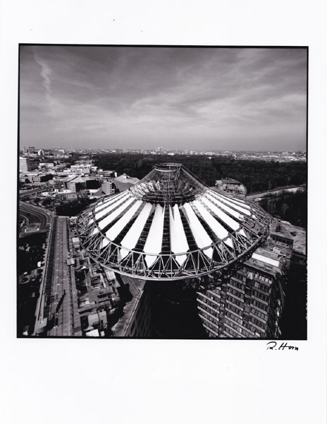 Horn, Roland: Stahl und Licht. Das Dach des Sony Center am Potsadmer Platz. Structure and Light. The roof of the Sony Center at Potsdamer Platz. Auflage 500 Exemplare. Berlin. Nicolaische Verlagsbuchhandlung. 2000. 118 S., 5 Blatt. Edelstahldeckel mit montierter Fotografie auf dem Vorderdeckel mit Spiralbindung in OPappschuber. Schuber mit kleinen Bereibungen. Sonst sehr gutes Exemplar. Hier die Nr. 270 von 500 Exemplaren der Vorzugsausgabe durchgehend mit schwarz-weissen Fotografien, einer montierten Originalprobe des teflonbeschichteten Gasfasergewebes der Dachkonstruktion und einem signierten Originalabzug „Das fertige Dach im März 2000“ versehen. Text in deutscher und englischer Sprache.