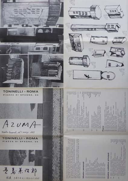 Azuma, Kengiro: Azuma. Erste Auflage. Rom. Toninelli. 1969. 67 x 48 cm. Kanten etwas nachgedunkelt und berieben. Sonst gutes Exemplar. Gefaltetes Plakat als Katalog zur Ausstellung Rom rücksetig bedruckt mit kurzer Bio-/ Bibliographie und schwarz-weissen Werkabbildungen. Text in italienischer Sprache.