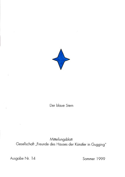 Der blaue Stern. Mitteilungsblatt der Gesellschaft der Freunde des Hauses der Künstler in Gugging. Ausgabe Nr. 14. Sommer 1999. Gugging. Eigenverlag. 1999. 21 x 14,5 cm. 35 S. OBroschur. Einbandkanten nachgedunkelt und mit kleinen Bereibungen. Sonst gutes bis sehr gutes Exemplar. Nr. 14 des hauseigenen Mitteilungsblattes Gugging 19996 mit zwei farbigen, montierten Postkarten sowie einer Galerieankündigung versehen.
