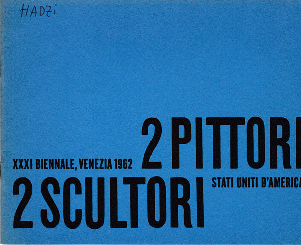 2 Pittori, 2 Scultori. Louise Nevelson Loren MacIver Jan Müller Dimitri Hadzi. XXXI. Bienale, Venezia 1962. Erste Auflage. Venedig. Biennale Venedig. 1962. 13,5 x 16,5 cm. 32 unpaginierte S. OBroschur. Einbandkanten etwas nachgedunkelt und mit kleinen Bereibungen, privater Name handschriftlich auf Vorderdeckel. Gutes Exemplar. Katalog zum amerikanischen Beitrag der XXXI. Bienale Venedig 1962. Jeweils mit Werkabbildungen der vier Künstler Louise Nevelson, Loren MacIver, Jan Müller und Dimitri Hadzi versehen. Text in englischer Sprache.