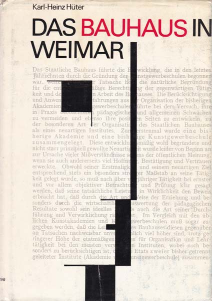 Hüter, Karl-Heinz: Das Bauhaus in Weimar. Studien zur gesellschaftspolitischen Geschichte einer deutschen Kunstschule. 2., unveränderte Auflage. Berlin. Akademie-Verlag. 1976. 24,5 x 17,5 cm. 286 S. OLeinen mit OUmschlag. Umschlagkanten nachgedunkelt und mit Bereibungen, Kanten stellenweise etwas knittrig, insgesamt leicht angestaubt. Sonst noch gutes Exemplarl Mit 68 Abbildungen und 104 Dokumenten versehen.
