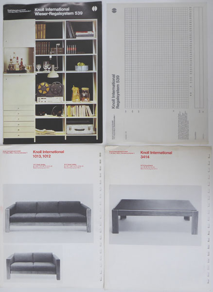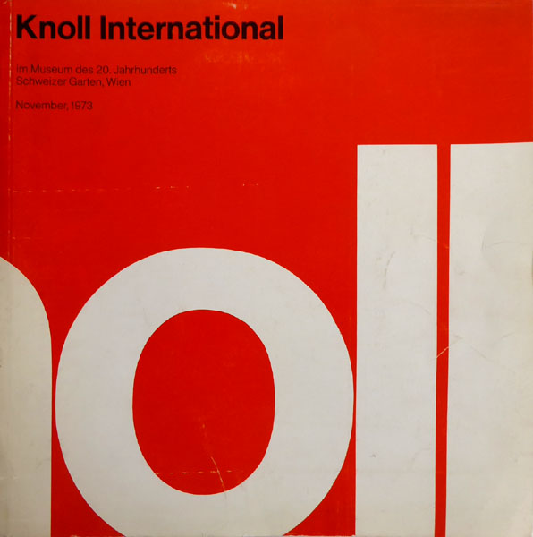 Knoll International. Im Museum des 20. Jahrhunderts. Schweizer Garten, Wien. November 1973. Erste Auflage. Wien. Museum des 20. Jahrhunderts. 1973. 29,5 x 29 cm. 70 unpaginierte S. OKarton. Einbandkanten nachgedunkelt und mit kleinen Bereibungen, Rückendeckel mit kleiner Knickfalte, oberer Rücken atwas angeplatzt. Gutes Exemplar. Schön gestalteter Katalog erschienen zur Ausstellung Wien 1973 durchgehend mit teils farbigen Abbildungen der Möbel sowie einer Biographie der Designer und Architekten versehen. Beiliegend wohl Musterkarten von Knoll mit Ringbuchlochung Nr. 1011 Armlehnsessel, Entwurf Jim Edlon, rückseitig 1013, 1012, Sofa 3sitzig und Sofa 2sitzig, und Nr. 3412, Couchtisch, Entwurf Jim Eldon, rückseitig 3414 Couchtisch, Entwurf Jim Eldon. Zusätzlich. dreiseitiges, gefaltetes Musterblatt zum Knoll International Wieser-Regalsystem 539.