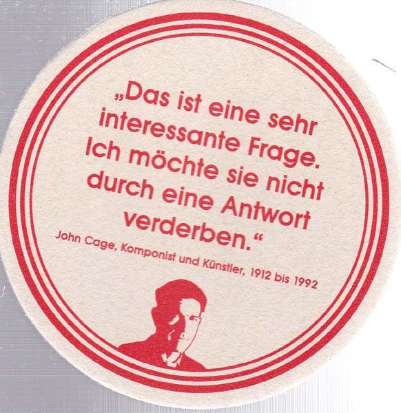 Cage, John – Richard Kostelanetz: John Cage (ex)plain(ed). Erste Auflage. New York. Schirmer Books. 1996. 21,5 x 14 cm. 194 S. Illustrierter OKarton. Einbandkanten mit kleinen Bereibungen, etwas angestaubt. Gutes Exemplar. Über John Cages Musik, Kunst, literarische Arbeiten und Philosophe. Text in englischer Sprache. Lose inliegend Bierdeckel „Uerige“ mit dem Zitat des Künstlers: „Das ist eine sehr interessante Frage, Ich möchte sie nicht durch eine Antwort verderben.“