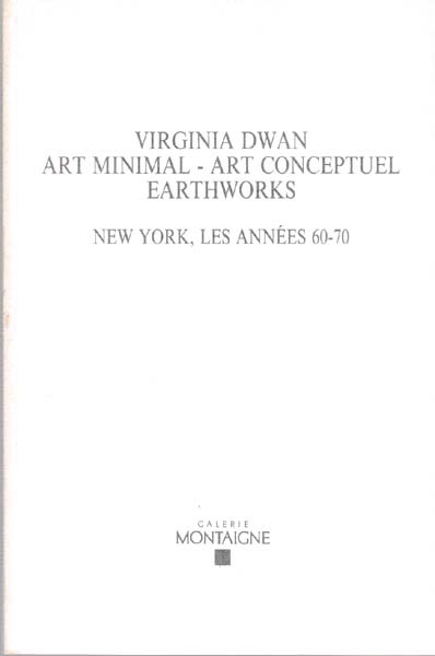 Virginia Dwan II. Art Minimal – Art Conceptuel. Earthworks. New York, Les annees 60 – 70. Erste Auflage. Paris. Galerie Montaigne. 1991. 24 x 16 cm. 64 unpaginierte S. OKarton. Einbandkanten etwas nachgedunkelt und mit kleinen Bereibungen. Sonst gutes Exemplar. Erschienen zur Ausstellung Paris 1. Oktober bis 14. Dezember 1991 mit zahlreichen, zum Teil farbigen Abbildungen versehen, darunter Werke von Walter de Maria, Michael Heizer, Sol Lewitt, Charles Ross und anderen. Text in englischer und französischer Sprache.