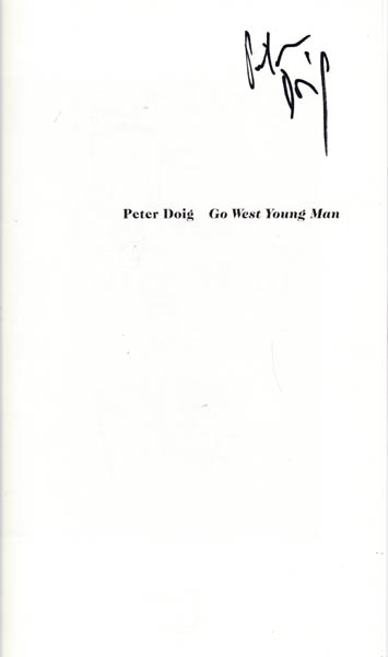Doig, Peter: Go West Young Man. Erste Auflage. Leipzig. Köln Museum der Bildenden Künste Leipzig. Verlag der Buchhandlung Walther Kölnig Köln. 2006. 24 x 17 cm. 67 S. OKarton mit OUmschlag. Umschlagkanten etwas nachgedunkelt und berieben. Sonst gutes bis sehr gutes Exemplar. Erschienen anlässlic der Ausstellung Leipzig 17. September bis 26. November 2006, die frühe, jahrelang eingelagerte Arbeiten des Künstler zeigte, meist entstanden auf einer Amerikareise 1982. Durchgehend mit ganzseitigen, farbigen Werkabbildungen sowie Texten von Rudi Fuchs und Hans-Werner Schmidt in deutscher und englischer Sprache versehen. Mit eigenhändiger Signatur des Künstles auf dem Vortitel!
