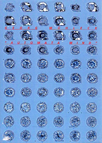 Mühleck, Georg: Automata Mind. Cellular Automata Simulations Datagraphy 1990 – 2001. Erste Auflage. Zürich. Verlag copy-left. 2002. 29,5 x 21,5 cm. 139 S. OKarton mit illustriertem OUmschlag. Kleberest am vorderen Deckel, Einbandkante leicht berieben. Sonst gutes bis sehr gutes Exemplar. Durchgehend mit farbigen, teils ganzseitigen Abbildungen versehen. Texte in Deutsch und Englisch. Mit einer handschriftlichen Signatur datiert auf 2002 auf dem Titel.