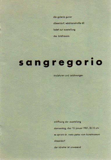 Sangregorio, Giancarlo: Skulpturen und Zeichnungen. Erste Auflage. Düsseldorf. Galerie Gunar. 1961. 21 x 15 cm. 2 Blatt. OKarton. Gutes Exemplar. Mit einem Text von Franco Russoli und 1 schwarzweissen Abbildung. Ausstellungskatalog der Galerie Gunar, Düsseldorf, ab Januar 1961.