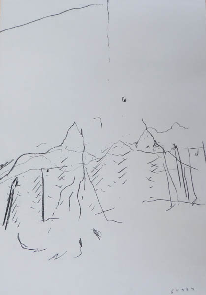 Helms, Dietrich: Blindzeichnung. Kohlezzeichnung auf Velin, 61 x 43 cm, unten rechts handschriftlich datiert 6.11.1977. Nicht signiert. Die Blindzeichnungen entstanden zwischen 1975 und 1982. Die Zeichnung ist ganzseitig abgebilde in: Dietrich Helms. Blindzeichnungen 1975 – 1982. Galerie Büning, 1983. Ein Eemplar mit einer handschriftlihen Widmung von Helms, datiert 31.3.1987, signiert, liegt bei.