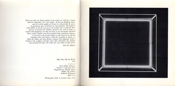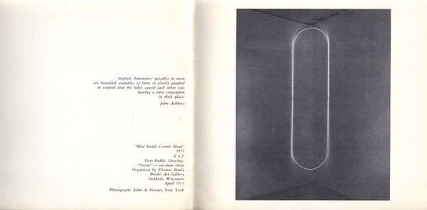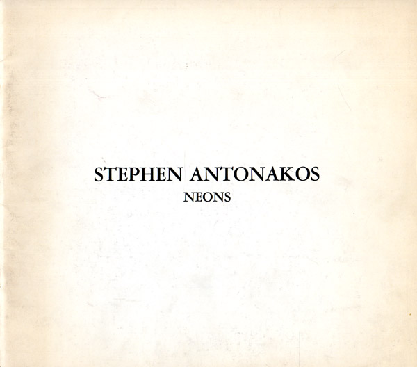 Antonakos, Stephen: Neons. Allen Priebe Art Gallerry Wisconsin State University-Oshkosh april 1971. Wisconsin. Allen Priebe Art Gallerry: 1971. 24 x 21 cm. 24 unpaginierte S. OKarton. Umschlag leicht angestaubt und verso etwas fleckig. Eine Kante gering gestaunt. Ordentliches Exemplar. Ausstellung mit Lichtobjekten Antonakos, wovon im Katalog 8 ganzseitig abgebildet sind. Text in Englisch.