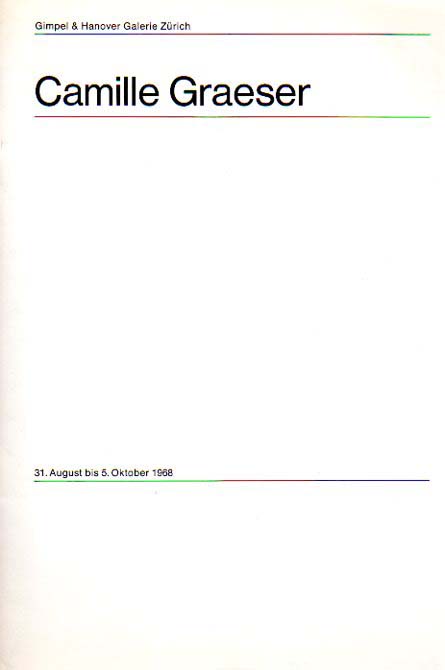 Graeser, Camille: 31. August bis 5. Oktober 1968. Gimpel & Hanover Galerie Zürich. Erste Auflage. Zürich. Gimpel & Hanover Galerie. 1968. 24 x 16 cm. 16 unpaginierte S. OKarton. Sehr gutes Exemplar. Beiliegend: „Camille Graeser: Ausstellung zum achtzigsten Geburtstag. 26. Februar bis 25. März 1972“, 16 unpaginierte S., OKarton, 24 x 16 cm. Ausserdem Beiliegend: „Camille Graeser: Bilder, Reliefs. 16. November – 22. Dezember 1974“, 15 x 11 cm, 16 unpaginierte S., OKarton. Zusammen 3 Kataloge zu Graeser der Galerie Gimpel & Hanover.
