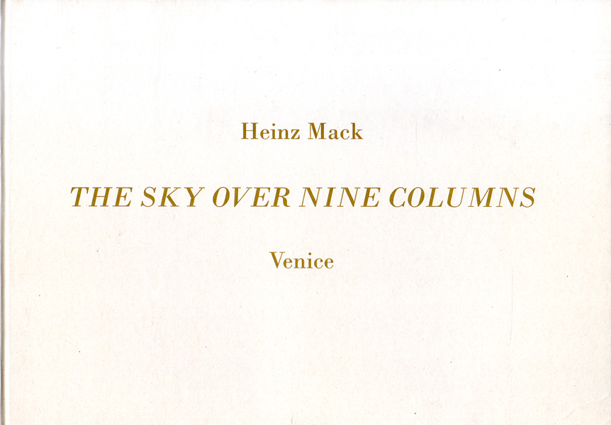 Mack, Heinz – Canossa, Sigifredo di (Herausgeber): The Sky Over Nine Columns. Venice. Progetto. 1. Auflage. Düsseldorf. Beck & Eggeling Kunsthandel. 2012. 30,3 x 42,1 cm. 56 unpaginierte S. Cremeweißer OPappband mit goldener Titeltypographie. Einband leicht angestaubt, kleine Knickspuren an der vorderen unteren Stoßkante, sonst sehr gutes Exemplar. Durchgehend mit meist farbigen Abbildungen versehen. Innendeckel mit goldfarbigermontierter Folie. Auf Schmutztitel vorne eine fünfzeilige, handschriftliche Widmung des Künstlers nebst Signatur an einen deutschen Buchgestalter. Der von der Galerie Beck & Eggeling publizierte Katalog stellt einen Vorabdruck des Venedig-Projekts aus dem Jahre 2012 dar. Realisiert wurden die Stelen Macks im Jahre 2014 im Rahmen der von Rem Koolhaas geleiteten 14. Architektur-Biennale in Venedig. Seltener Katalog, da zu dieser Zeit nicht für eine öffentliche Publikation vorgesehen und wohl überwiegend als Geschenk ausgegeben. Die ISBN, die für dieses Buch vergeben wurde, ist nicht zugelassen. Das Werk ist nicht identisch mit der gleichnamigen Publikation aus dem Jahre 2016.