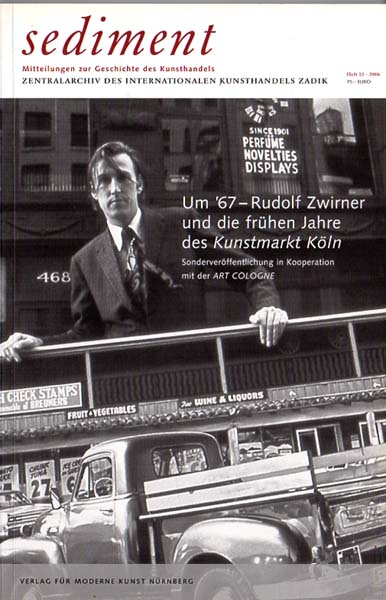 sediment. Mitteilungen zur Geschichte des Kunsthandels. Heft 12, 2006. Um 67 – Rudolf Zwirner und die frühen Jahre des Kunstmarkt Köln. Sonderveröffentlichung in Kooperation mit der ART COLOGNE. Nürnberg. Verlag für moderne Kunst. 2006. 28 x 18 cm. 104 S. Illustrierter OKarton. Sehr gutes Exemplar. Sediment Heft 12. Zentralarchiv des Internationalen Kunsthandels ZADIK. Durchgehend mit s/w Abbildungen versehen.