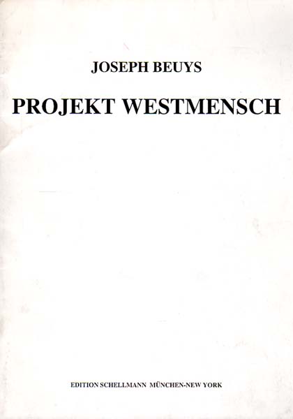 Beuys, Joseph: Projekt Westmensch. Erste Auflage. München / New York. Edition Schellmann. 1992. 29,5 x 21 cm. [17] unpaginierte S. Illustrierter OKarton. Etwas angestaubt und fingerfleckig, sonst gutes Exemplar. Durchgehend mit meist farbigen Abbildungen versehen. Broschüre zur geplanten Faksimile-Edition der vier Bücher des „Projekt Westmensch“ von Joseph Beuys.