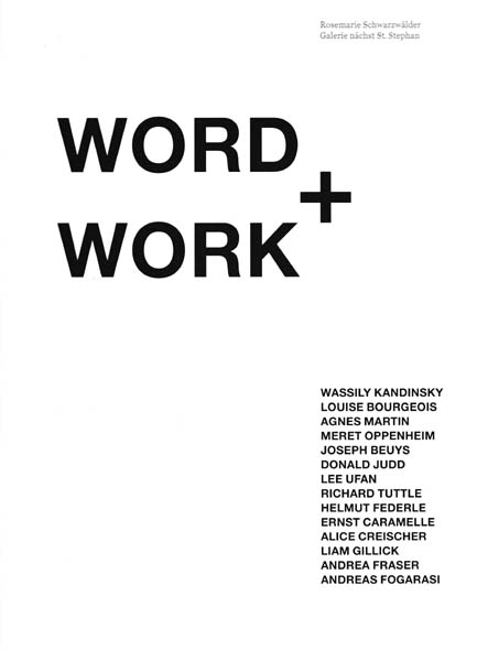 Schwarzwälder, Rosemarie Herausgeber]: WORD + WORK. Erste Auflage. Wien. Galerie nächst St. Stephan. 2013. 32,5 x 23,5 cm. 96 unpaginierte S. OKarton. Sehr gutes Exemplar. Katalog zur Ausstellung Wien 7. September bis 3. Oktober 2013. Text in deutscher und englischer Sprache. Durchgehend mit Abbildungen versehen. Unter den ausgestellten Künstlern waren Louise Bougeois, Agnes Martin, Donald Jugg, Andrea Fraser, Liam Gillick u. a.