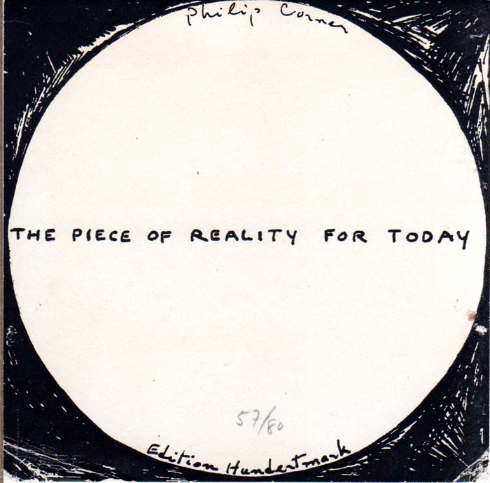 Corner, Philip: The Piece of Reality for today. Auflage: 80 Exemplare. Köln. Edition Hundertmark. [1983]. 11 x 11 x 3 cm. Papp-Box mit Metallklammerverstärkung. Sehr gutes Exemplar. Kleines Multiple in einer Auflage von 80 handschriftlich auf dem Deckel nummeriertren Exemplaren. Enthält auf dem Grund der Box einen montierten runden Spiegel, darüber im inneren des Deckels befestigt ein Leporello, 120 x 10 cm, mit dem handschriftlichen Text „The Piece of Reality for today“.