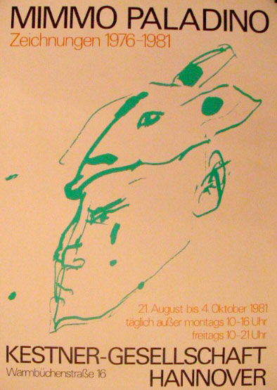 Paladino, Mimmo: Zeichnungen 1976 – 1981. [Plakat] 21. August bis 4. September 1981. Kestner-Gesellschaft Hannover. Hannover. Kestner Gesellschaft. 1981. 84 x 59 cm. Sehr gutes Exemplar. Abstrahierter Kopf in Grün auf weißem Grund.
