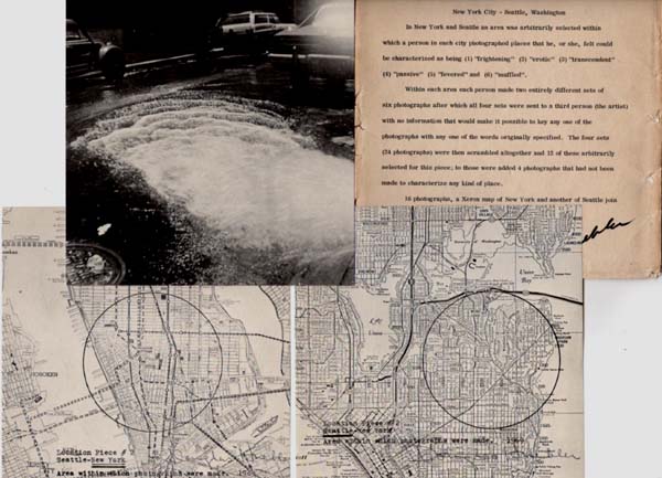 Huebler, Douglas: Location Piece #2. New York City – Seattle, Washington. New York. [Multiples]. 1970. 19 x 19 cm. 1 Blatt, 2 Karten, 16 Fototafeln. OPapier-Kuvert. Kuverts noch verschlossen. Etwas angestaubt und marginal berieben, sonst sehr gutes Exemplar. Erste Ausgabe. Enthält 2 Tafeln mit Landkarten sowie 16 Phototafeln und ein Textblatt von Douglas Huebler. Als Künstlerbuch publiziert und zum Teil der Multiple-Box „Artists and Photographs“ beigegeben. [Vgl. Moeglin-Delcroix: Esthetique du Livre d’Artiste 1960 / 1980 – Paris; Celant: Book as Artwork 1960 / 1972; Lailach. Printed Matter – Die Sammlung Marzona, 2005, S. 127].