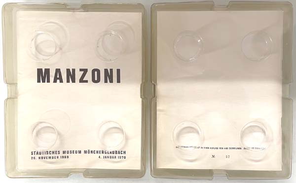 Manzoni, Piero: MANZONI. Städtisches Museum Mönchengladbach, 26. November 1969 – 4. Januar 1970. Mönchengladbach. Städtisches Museum Mönchengladbach. 1969. 21 x 17 cm. 32 unpaginierte S. OBroschur in transparenter OKunststoff-Box. Die Box nur minimal nachgedunkelt, sehr schönes, sauberes Exemplar. Nr. 157 von 440 nummerierten Exemplaren des Kassettenkataloges in Form einer transparenten Kunststoff-Box mit je vier Ausbuchtungen. Inliegend ein Katalog mit Texten von Udo Kultermann, Piero Manzoni und Johannes Cladders. Mit 22 Abbildungen. Manzoni, schon 1963 mit noch nicht 30 Jahren verstorben, gilt als einer der Wegbereiter der Konzeptkunst. Vielleicht noch radikaler als Yves Klein hat er in die bestehenden Kunstverhältnisse eingegriffen und Umwälzungen in Gang gesetzt. Beiliegend die Einladungskarte zur Austellung. [Vgl. Glasmeier – Die Bücher der Künstler, Nr. 445; S.181; Gagosian / Celant S. 351; Rennert / Titz. Die Kassettenkataloge des Städtischen Museums Mönchengladbach 1967 – 1978, Köln 2021, S.112f, Nummer 09].
