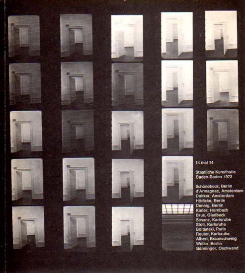14 mal 14. 16.3. bis 22.4. 1973, Staatliche Kunsthalle Baden-Baden. Erste Auflage. Baden-Baden. Staatliche Kunsthalle . 1973. 21 x 19 cm. 116 unpaginierte S. OKarton. Einbandkanten etwas berieben. Gutes Exemplar. Die hier bereits in Folge veranstaltete Ausstellung 14 mal 14 zeigte 1973 temporär für 14 Tage Arbeiten u.a.v. Dekker, Hödicke, Kiefer, Brus, Boltanski und Reuter.