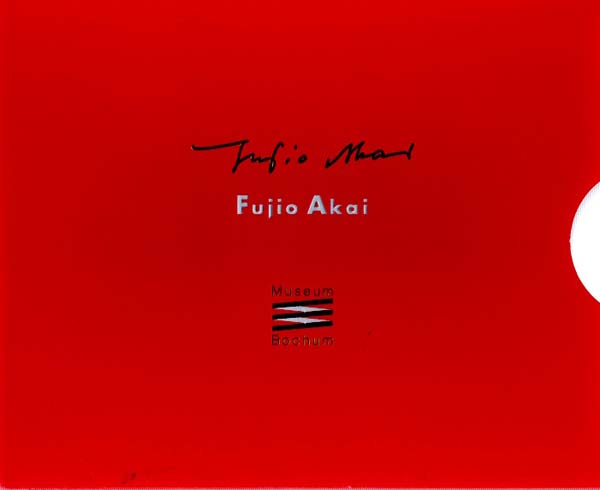 Akai, Fujio: – Harmlos dazwischen? – der Maler Fujio Akai / – harmless, in-between – the painter Fujio Akai. [Von] Hans Guenter Golinski. 1. Auflage. Ohne Ort. Museum Bochum. (Um 1993). 24,5 x 20 cm. 1 Blatt. 10; 10; 10; 10 S.,35 Tafeln, 1 Blatt. OPapp-Kassette und Seidenband in Karton-Chemise. Kleines Fleckchen auf dem Kassettendeckel, sonst tadelloses Exemplar. Vom Künstler selbst entworfenes Künstlerbuch als kleine Werkübersicht. Enthält in 4 Leporellos a 10 Seiten einen Text von Hans Guenter Golinski sowie Bio- Bibliographische Daten, jeweils in Deutsch und Englisch, Briefauszüge etc. sowie 35 Werkabbildungen auf Karten montiert.Kartenblock durch Seidenband gehalten. Die aufwändige Kassette nach einer Gestaltung des Künstlers. Mit ganzseitiger Zueignung durch Fijio Akai an den Fotografen Franz Fischer auf dem Innendeckel in Deutsch und in japanischen Schriftzeichen, sihgniert in schwarzer Tinte sowie in Weiß, datiert 18.01.2004.