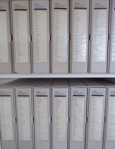 Romann, Lothar (Herausgeber): Kritisches Lexikon der Gegenwartskunst. München. WB Verlag. 1995-2003. 32 x 29 x 8,5 cm. Ca. 7800 S. 15 OPlastik-Ringbuch-Ordner mit Einstecklaschen in Plastik-Schubern. Der Beitrag Imi Knöbel fehlt, sonst sehr gutes Exemplar. Enthält in 15 Ordnern in losen Einlagen über ca. 470 Lieferungen mit Künstlermonographien, Ausstellungs- und Katalogverzeichnis, Porträtfotos der Künstler, Signaturabdruck etc. Die Zusammenstellung folgt im wesentlichen dem Lieferungsverlauf, ist aber teils darüber hinaus individuell erweitert, einige wenige gelistete Monographiebeiträge fehlen entgegen dem Verzeichnis. Notiert sind nahezu alle bedeutenden, international anerkannten Künstler der Nachkriegszeit bis in die Neunziger Jahre.