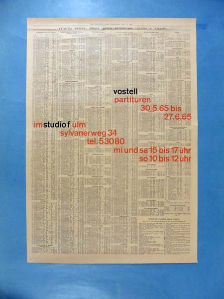 Vostell, Wolf: Partituren. [Plakat] studio ulm, 30.5. bis 26.6.65. Ulm. studio ulm. 1965. 1 Blatt. Das montierte Blatt mit kleinem Einriss am rechten Rand, an der Klebenaht etwas knittrig, sonst gutes Exemplar. Plakat zur Ausstellung „Partituren“ im studio ulm mit Text, Schwarz und Rot in Siebdruck über ganzseitiger Seite aus „The Financial Times, Wednesday, May 19, 1965“ (59,5 x 41,5 cm), montiert auf blauem Kartonbogen 83,7 x 59,4 cm). Außerst selten. [Vgl. Walker Art Center, Accession Number: 1989.469].