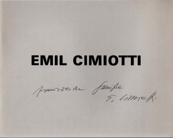 Cimiotti, Emil: Bronzen und Zeichnungen. 2. Dezember 1976 bis 8. Januar 1977. Erste Auflage. München. Galerie van de Loo. 1977. 23 x 18 cm.. 20 unpaginierte S. OKarton. Sehr gutes Exemplar. Mit handschriftlichem Gruß des Künstlers auf dem Einband, signiert. Mit 14 s/w und 3 farbige Abbildungen.