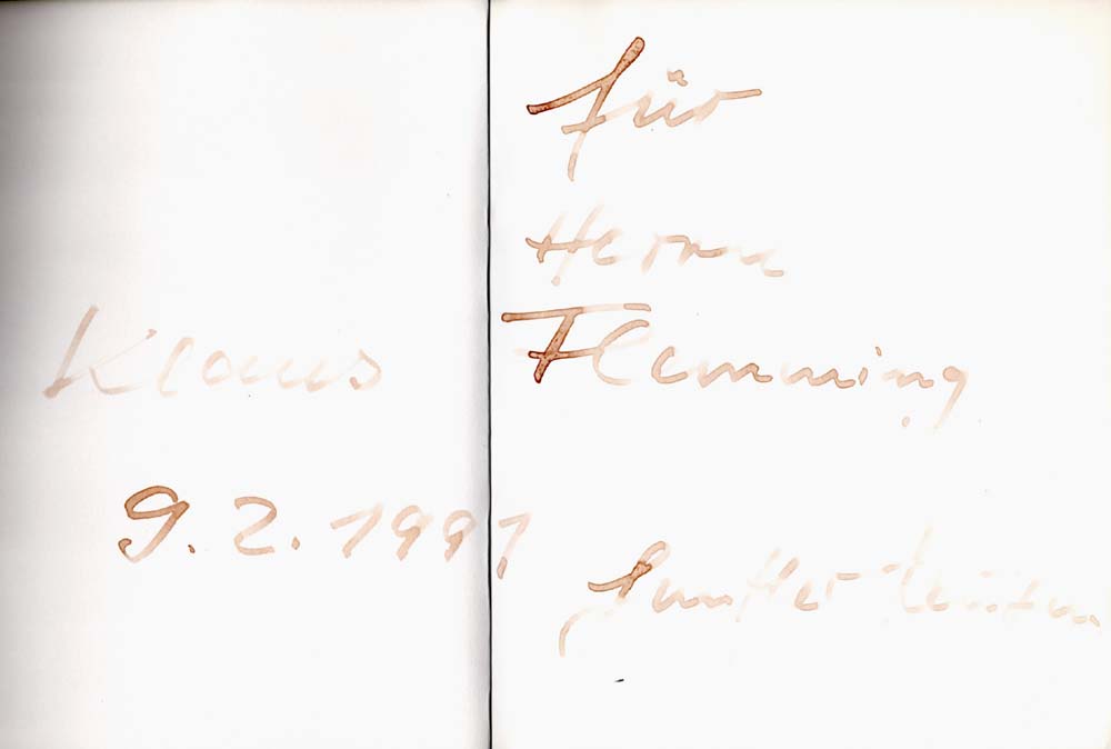 Keusen, Gunther: „… die holunderrote Spur“. [Kunsthalle Recklinghausen, 6. Januar bis 3. Februar 1991]. 1. Auflage. Museen der Stadt Recklinghausen. 1991. 29 x 24 cm. 96 S. OKarton. Gutes bis sehr gutes Exemplar. Über den Innendeckel sowie den Vorsatz eine ganzseitige, schöne mit Holundersaft geschriebene Widmung an einen ehemaligen Kurator des Museum Abteiberg in Mönchengladbach, signiert und datiert 9. 2. 1991. Mit Textbeiträgen von Ferdinand Ullrich, Jürgen Wißmann, Wolfram Heistermann und Max J. Kobbert. Durchgehend mit meist farbigen Abbildungen versehen. Beiliegend: Ganzseitiger, maschinenschriftlicher Brief Keusens, handschriftlich signiert.