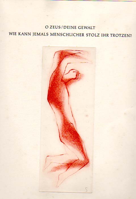 Sieler, Manfred: Antigone. Zehn Radierungen. Mit ausgewähltenm Texten der Tragödie des Sophokles. Auflage 30 Exemplare. Berlin. Selbstverlag. 1957. 40 x 29 cm. 13 Doppelbögen. OPapp-Kassette. Kassette im unteren Rückengelenk etwas angeplatzt. Die Bögen papierbedingt teils mit einem Hauch von Stockfleckchen, ein Bogen stockig. Insgesamt aber noch gutes Exemplar. Enthält auf den Innenseiten der Bögen 10 ganzseitige, signierte Original-Radierungen sowie eine Titelradierung in Rötel, monogrammiert. Nummer 17 von 30 Exemplaren. Die Textauszüge sind der Übertragung von Roman Woerner (Insel Verlag) entnommen, die Radierungen druckte O. Felsing. Beiliegend eine Radierung von Curt Beckmann auf Bütten (Toros als Akt), in der Platte monogrammiert, verso unterzeichnet und datiert 1985.