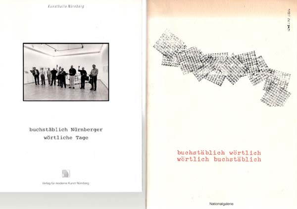 Glasmeier, Michael [Herausgeber]: Buchstäblich wörtlich, wörtlich buchstäblich. Eine Sammlung konkreter und visueller Poesie der sechziger Jahre in der Nationalgalerie Berlin. Bearbeitet von Michael Glasmeier. Berlin. Staatliche Museen Preussischer Kulturbesitz. 1987. 30 x 21 cm. 281 S. OKarton. Rücken und oberer Steg gebräunt. Einige sehr dezente Bleisitiftmarkierungen, sonst gutes Exemplar. Wichtiger und materialreicher Katalog zur konkreten Poesie mit Bibliographie. Durchgehend mit Abbildungen versehen. Beiliegend das Plakat zur Ausstellung in gleicher Gestaltung wie der Katalog. Dabei: „buchstäblich Nürnberger wörtliche Tage“. Dokumentation von Aktionen und Vorträgen anläßlich der Ausstellung „buchstäblich wörtlich – wörtlich buchstäblich“ in der Kunsthalle Nürnberg im Juni und Juli 1989. Herausgegegen von Michael Glasmeier und Lucius Grisebach. Mit einer beigegebenen Single mit Beiträgen von Frieder Butzmann, Sven-Ake Johansson und Thomas Kapielski, Bernhard Heidsiek und Emmett Williams.
