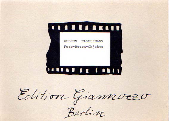 Wassermann, Gudrun: Foto-Beton-Objekte. Erste Auflage. Berlin. Edition Giannozzo. 1981. 15 x 21 cm. 70 unpaginierte S. OKarton. Minimal lichtrandig. Sehr gutes Exemplar. Edition Giannozzo 9. Herausgeber Rolf Langebartels. Mit ganzseitigen fotografischen Abbildungen, zum Teil mehrfach in Leporello-Manier gefaltet. Auflage 300 Exemplare.