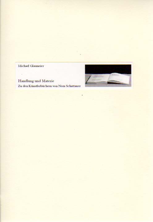 Schattauer, Nora – Michael Glasmeier: Handlung und Materie. Zu den Künstlerbüchern von Nora Schattauer. Erste Auflage. [Ohne Ort]. Selbstverlag. 2008. 30 x 21 cm. 20 unpaginierte S. OKarton mit montiertem Titelschild in OZellophan-Umschlag. Sehr gutes Exemplar. Titel und hinterer Einband mit handschriftlicher Widmung bzw. Signatur der Künstlerin, datiert 2008. Der in dieser Publikation abgedruckte Vortrag wurde von Michael Glasmeier am 11.9.2008 im Studienzentrum für Künstlerpublikationen, Neues Museum Weserburg, Bremen im Rahmen der Ausstellung „Nora Schattauer: Gefasste Form – Künstlerbücher“ gehalten. Mit 7 s/w Abbildungen. Beiliegend: 7 geheftete Blätter mit Informationen zu der Ausstellung.