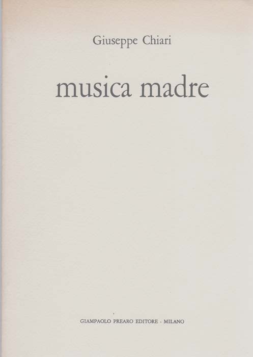 Chiari, Giuseppe: musica madre. Preariana a cura di Tommaso Trini. First edition. Milano. Giampaolo Prearo Editore. 1973. 23 x 16 cm. 136 S., 10 Blatt. OKarton mit OKlappenumschlag. Rücken und oberer Steg gering nachgedunkelt, sonst sehr gutes Exemplar. Gedruckt auf verschiedfenfarbigem Papier. Texte in Italienisch.