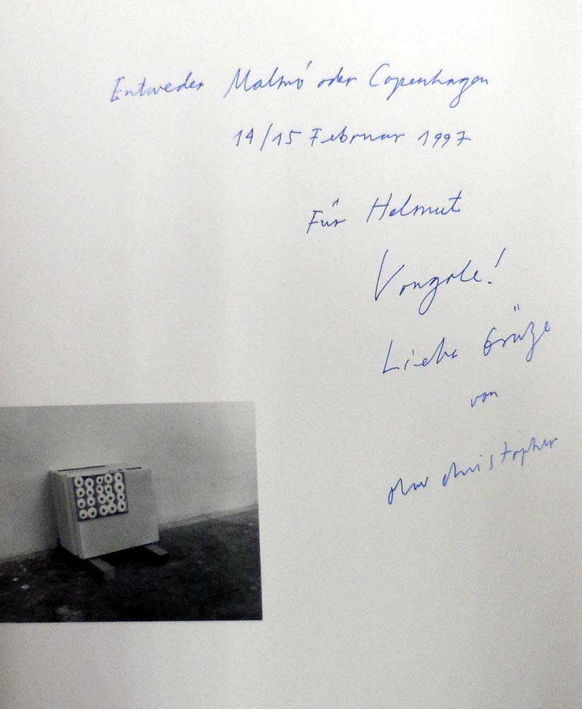 Jenssen, Olav Christopher: Vongole. [Malmö Konsthall, 15 februari-13 april 1997]. 1. Auflage. Malmö Konsthall. 1997. 31 x 25 cm. [35] S. OKarton mit OUmschlag. Sehr gutes Exemplar. Handschriftliche Widmung von Olav Christopher Jenssen auf dem Vorsatz, signiert, datiert „14/15 Februar 1997“. Text in Schwedisch und Englisch. Mit einem Gespräch zwischen Sune Nordgren und Olav Christopher Jenssen.