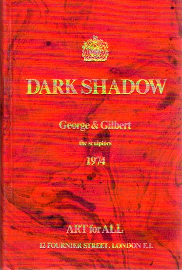 Gilbert & George: Dark Shadow. [By] Gilbert & George the sculptors 1974. Edition of 2000. London. Nigel Greenwood. 1976. 20 x 13 cm. 139 Blatt (278 S.). Schwarz-Rot marmoriertes OLeinen mit Goldprägung. Kapital minimal berieben, sonst sehr gutes, frisches Exemplar. Nummer 1988 / 2000 handschriftlich in rotem Filzstift nummerierten und signierten Exemplaren. Durchgehend mit s/w Fotoabbildungen versehen. Wie auch schon bei „Side by Side“ ist das Buch in handmarmoriertes Leinen mit variierenden Verläufen gebunden. [Vgl. Künstler-Bücher I, S. 69 Nr.19; Giorgio Maffei. Libri d´Artista. 2010, S. 113/114 mit Abbildungen].