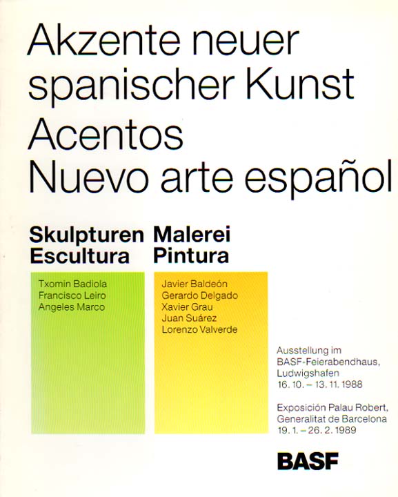 Akzente neuer spanischer Kunst / Acentos Nuevo arte espanol. BASF-Feierabendhaus, Ludwigshafen, 16.10. – 13.11.1988; Palau Robert, Generalitat de Barcelona, 19.1. – 26.2.1989. Erste Auflage. Ludwigshafen. BASF Aktiengesellschaft. 1988. 79 S. OKarton. Einbandkanten leicht gedunkelt, sonst gutes Exemplar. Texte in Deutsch und Spanisch. Mit einer Einführung von Maria de Corral und Texten von Txomin Badiola, Javier Baldeon, Gerardo Delgado, Xavier Grau, Francisco Leiro, Angeles Marco, Juan Suarez und Lorenzo Valverde. Durchgehend mit farbigen Abbildungen versehen. Beiliegend: Berichtigtes Inhaltsverzeichnis.