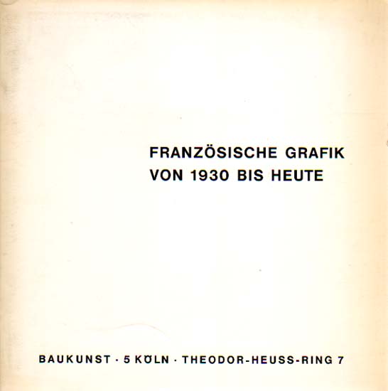 Französische Grafik von 1930 bis heute. Mit Arbeiten von 75 Künstlern. Baukunst, Köln, 21. März bis 22. Mai 1968. 1. Auflage. Köln. Baukunst Galerie. 1968. 21 x 21 cm. 32 unpaginierte S., Faltblatt. OKarton. Einbandkanten teilweise stärker gedunkelt und teilweise leicht berieben, sonst gutes Exemplar. Mit einem beiliegendem Faltblatt mit einem Vorwort von Jean Goldman. Enthält 5 schwarz-weiß Abbildungen von Arbeiten von Georges Braque, Andre Dunoyer de Segonzac, Hans Hartung, Pablo Picasso und Jacques Villon.