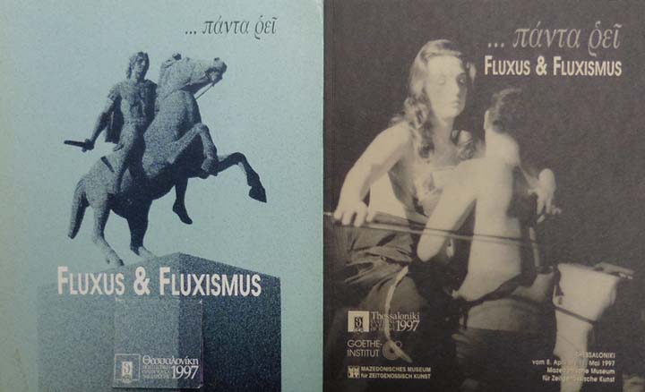 Fluxus & Fluxismus. Thessaloniki [Kulturhauptstadt Europas 1997] vom 8. April bis 11. Mai 1997, Mazedonische Museum für Zeitgenössische Kunst. Erste Auflage. 2 Bände. Thessaloniki. Goethe -Institut Thessaloniki / Mazedonische Museum für Zeitgenössische Kunst. 1997. 27 x 23 cm. 131 S.; 79 S. OKlappenkarton mit montiertem Leporello; OKarton. Einbände mit leichten Gebrauchsspuren sowie einige Bleistiftanstreichungen im Text, sonst gutes Exemplar. 2 Bände – enthält den Ausstellungskatalog in Griechisch sowie den Übersetzungsband in Englisch und Deutsch. Mit einem Beitrag von Rene Block und mit Biographien der beteiligten Künstler. Durchgehend mit meist farbigen Abbildungen versehen. Die Künstler: Eric Andersen, Joseph Beuys, George Brecht, John Cage, Giuseppe Chiari, Henning Christiansen, Robert Filliou, Ludwig Gosewitz, Al Hansen, Dick Higgins, Joe Jones, Milan Knizak, Alison Knowles, Arthur Köpcke, George Maciunas, Nam June Paik, Benjamin Patterson, Tomas Schmit, Ben Vautier, Wolf Vostell und Emmett Williams.