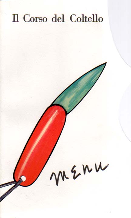 Oldenburg, Claes [und] Coosje van Bruggen, Frank O. Gehry: Il Corso del Coltello. [Venezia, Campo dell`Arsenale, 6-7-8 settembre 1985 – ore 21]. Erste Auflage. Torino / Milano. Gruppo Finanziario Tessile / Nuove edizioni Gabrielle Mazzotta. 1985. 27 x 16 cm. OKarton mit Cut Out und montierter Titelillustration. Sehr gutes Exemplar. Katalog in Form einer Speisekarte. Erschienen anläßlich der Performance „Il Corso del Coltello (The Course of the Knife)“ von Oldenburg, van Bruggen und Gehry in Venedig. Text in Italienisch und Englisch.