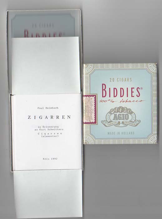 Heimbach, Paul: Zigarren. In Erinnerung an Kurt Schwitters Cigarren (elementar). Auflage 100 Exemplare. Köln. Paul Heimbach. 1992. 9,0 x 8,3 x 1,6 cm. OPapp-Schachtel. Sehr gutes Exemplar. Edition, Nummer 85 / 100 handschriftlich nummerierten und von Paul Heimbach signierten Exemplaren, datiert April 1992. Enthält, lose eingelegt als Faltbögen in eine Biddies Zigarillo-Schachtel das Lautgedicht „Cigarren“ von Kurt Schwitters, den Text „Kandinsky und ich“ von Nina Kandinsky sowie Wortpoesien ud Lautgedichte von Paul Heimbach als Hommage an Schwitters. Teils auf transparentem Pergamin gedruckt, teils als Leporello gefaltet.