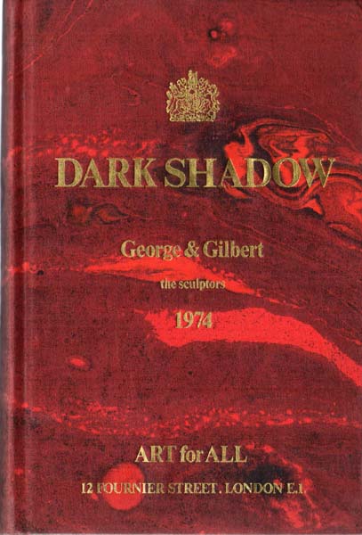 Gilbert & George: Dark Shadow. [By] Gilbert & George the sculptors 1974. Edition of 2000. London. Nigel Greenwood. 1976. 20 x 13 cm. 139 Blatt (278 S.). Schwarz-Rot marmoriertes OLeinen mit Goldprägung. Rücken etwas aufgehellt, minimal schief gelesen. Gutes bis noch sehr gutes Exemplar. Nummer 1643 / 2000 handschriftlich in rotem Filzstift nummerierten und signierten Exemplaren. Durchgehend mit s/w Fotoabbildungen versehen. Wie auch schon bei „Side by Side“ ist das Buch in handmarmoriertes Leinen mit variierenden Verläufen gebunden. [Vgl. Künstler-Bücher I, S. 69 Nr.19; Giorgio Maffei. Libri d´Artista. 2010, S. 113/114 mit Abbildungen].