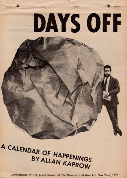 Kaprow, Allan: Days off. A Calendar of Happenings. First printing. New York. Museum of Modern Art. 1970. 38,5 x 27,5 cm. 64 unpaginierte Blatt. Abreisskalender, Klammergeheftet. Papier durch Lagerung leicht aufgerollt, letztes Blatt verso im unteren Rand gebräunt, sonst sehr gutes Exemplar. Heute eher seltener, da sehr fragiler, in Form eines Abreisskalenders gestalteter Katalog der Happenings Kaprows, die in der Zeit vom 9. Februar bis 2. Dezember 1969 stattfanden. Mit durchgehender Fotodokumentation, Fotografien unter anderem von Alan Kaprow, Dennis Hopper und Catol Bowen.